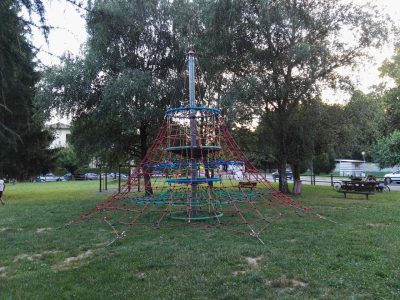 PIù in là troviamo una bella piramide di corda per arrampicarsi, un’altalena con il piatto grande e una struttura per arrampicarsi in legno.